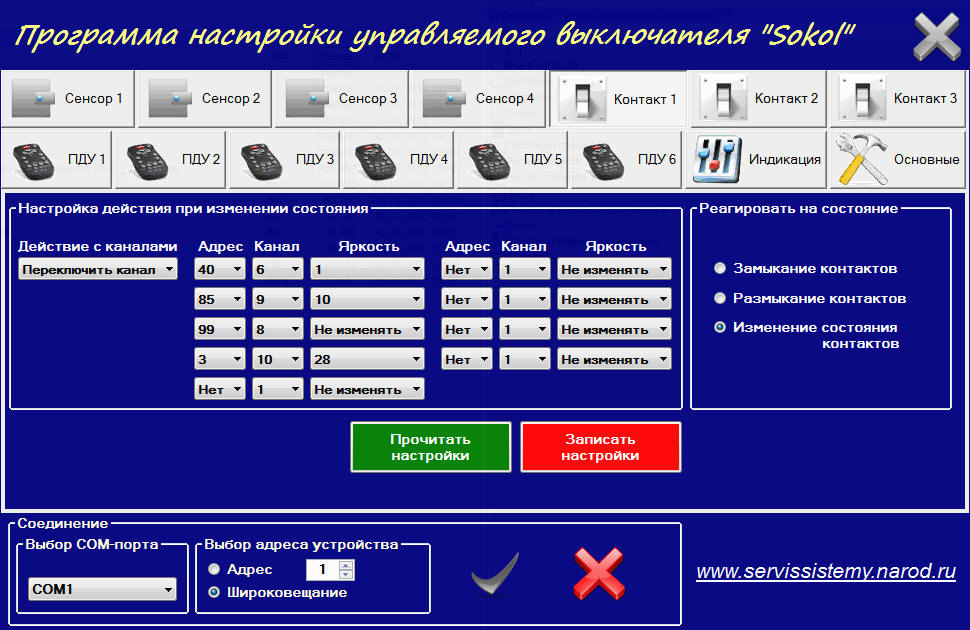 Настройки выключателей типа "сухой контакт" могут использоваться для включения/отключения/переключения каналов или сценариев освещения от обычных квартирных выключателей освещения с фиксацией положения, датчиков движения, открывания дверей, сигнализации. Единственное отличие этих вкладок от предыдущих заключается в отсутствии реакции на длительное нажатие, а, следовательно, регулировки яркости каналов. Вместо этого возможно выбрать на какое из действий реагировать (замыкание/размыкание/переключение контактов).