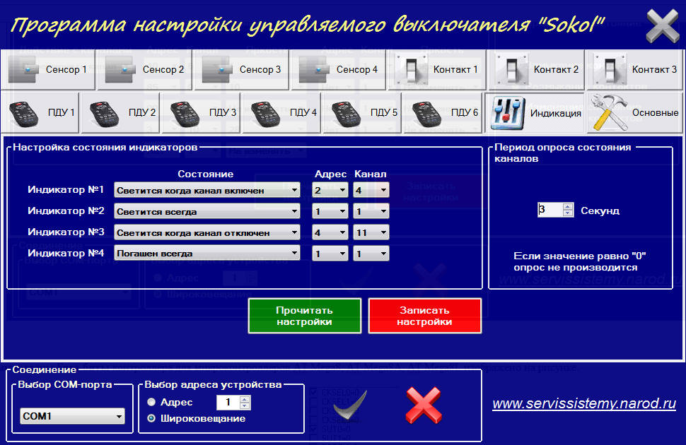 Вкладка "Индикация" позволяет настроить режим работы каждого из 4-х светодиодов устройства. Основные режимы работы приведены на рисунке ниже и в пояснениях не нуждаются. В поле "Период опроса состояния каналов" задаётся временной интервал, по истечении которого устройство опрашивает выбранные каналы модулей и выводит их состояние на светодиодные индикаторы. При отсутствии связи с выбранным модулем управления электрооборудованием соответствующий светодиод будет быстро мигать.