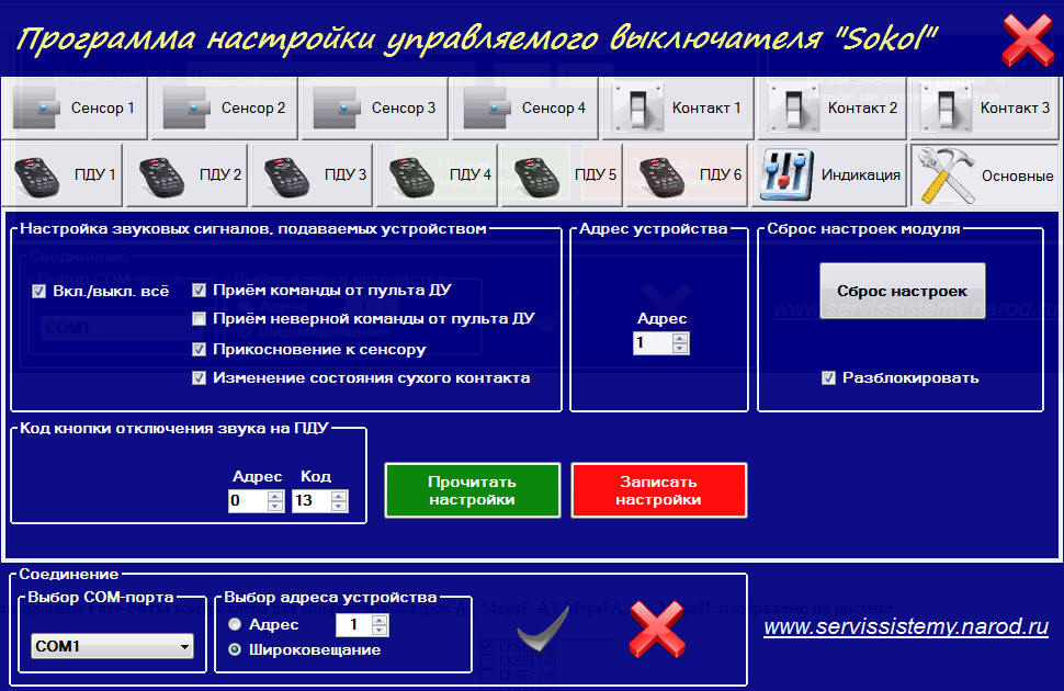 Вкладка "Основные" позволяет выполнить настройку основных функций управляемого выключателя и выполнить сброс настроек "по умолчанию". Кнопка отключения звука на пульте дистанционного управления позволяет индивидуально управлять звуком данного управляемого выключателя. При включении звуковых сигналов устройство подаст звук нарастающего тона, а при отключении - спадающего тона, так что не запутаетесь... Для защиты "от дурака" как и в предыдущем устройстве предусмотрена блокировка кнопки "Сброс настроек".
