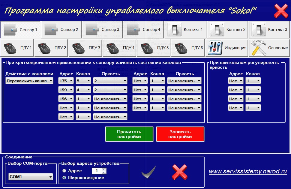 При длительном (более 1 секунды) прикосновении к сенсорному контакту или длительном нажатии на кнопку пульта ДУ возможно регулирование яркости до 4-х каналов (увеличить число каналов в данном случае не представляется возможным ввиду ограниченного быстродействия системы). Адреса и номера каналов задаются в правом поле.