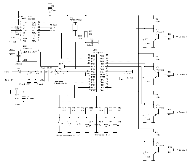 Принципиальная электрическая схема устройства изображена на рисунке ниже (кликабельно).
